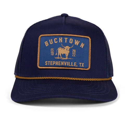 The Stockman Hat tips its brim to the cattlemen, the day riders, and the backbone of Bucktown XV Ranch. With a bold longhorn patch and timeless navy and gold colorway, this one earns its keep in the pasture or the pickup.