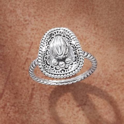 Detailed sterling silver miniature cowboy hats have an antiqued finish to highlight elaborate etching. Ring has a rope-twist band and is 2/3" wide.