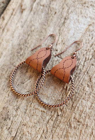Handmade genuine leather earrings. Engraved, lightly oiled then burnished to a bright shine. Finished with antique copper findings and rope loop.