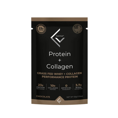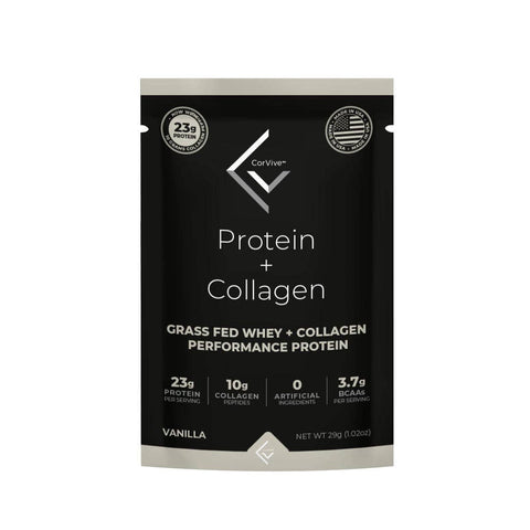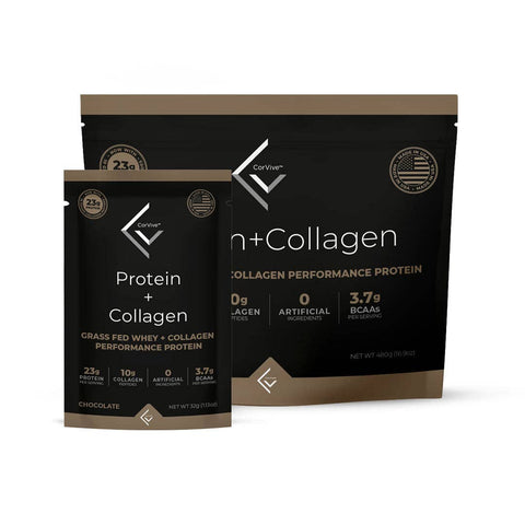 Protein + Collagen is CorVive's grass-fed whey protein shake with 10 grams of collagen added! It comes in two great flavors: chocolate & vanilla. CorVive's protein powder with collagen contains no artificial ingredients, 3.7 grams of BCAAs, and 23 grams of total protein per serving.