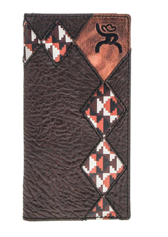 This Roughy rodeo wallet features Brown & Tan Dimond Patchwork exterior & brown interior, and includes our custom woven Hooey Logo liner.