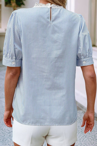 Little Daisy Closet - LDC Stripe Floral Lace Splicing Puff Sleeve Blouse: Sky Blue / L