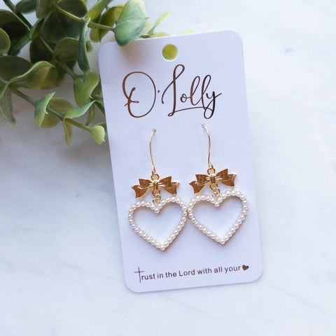 O’Lolly Jewelry - Gold Bow w/Heart Shaped Pearl Dangle Earrings - Valentine Style 13