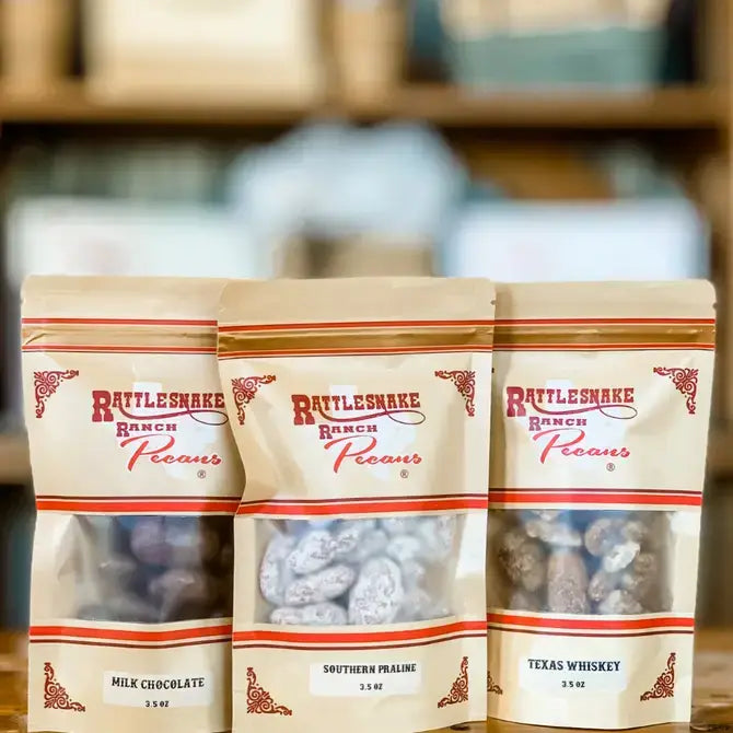 Rattlesnake Ranch Pecan Co. brings you our pre-order 3.5 oz. Snack Size Kraft Bags. Perfect for a quick, delicious, and nutritious snack on the go. Our pecans are sourced from our historic ranch in Crockett, TX, ensuring the highest quality and taste. Note: These are heat-sensitive. Our founders, Clint and Hannah Craycraft, are involved in every step of operations, from sourcing to packaging, to guarantee your satisfaction. Enjoy the rich, unique flavors of Texas with every bite!