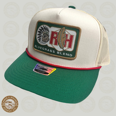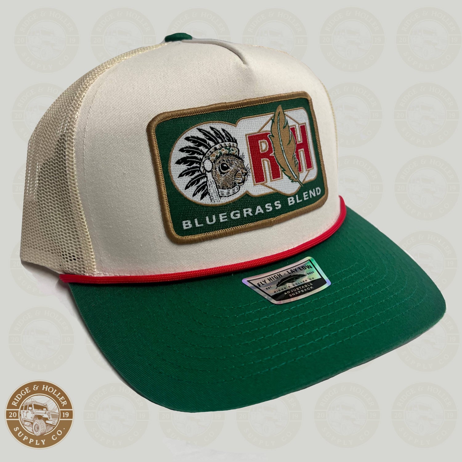 The Bluegrass Blend has returned and it's even better than before! Take a look at this high crown SnapBack hat in cream and green with rope - it's the perfect accessory.