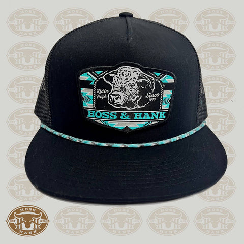 This tall boy SnapBack is designed in all black with a touch of turquoise with a stylish rope detail and features the Hoss&Hank outlawfitters logo. Expertly crafted and designed with a stylish rope detail. Perfect for everyday wear or as a unique addition to your hat collection.