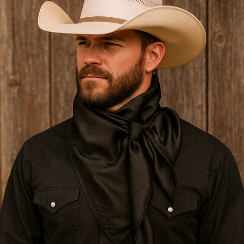 Our classic wild rag/scarf is black with a floral jacquard pattern. A perfect square - measuring 35"x35". Adding that extra touch of a western style to your outfit.