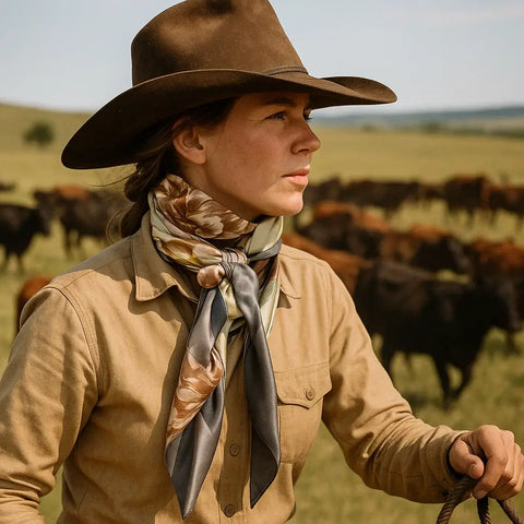 Our classic wild rag/scarf in lovely floral design with colors of cream and silver. It is a square and measures 35" x 35". It is sure to add a bright pop of color to any outfit.