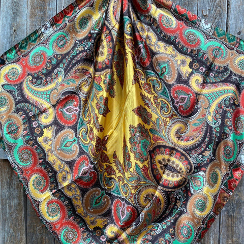 Our classic wild rag/scarf in an assortment of colors with a paisley pattern. It is a square and measures 35" x 35". It is sure to add a bright pop of color to any outfit.