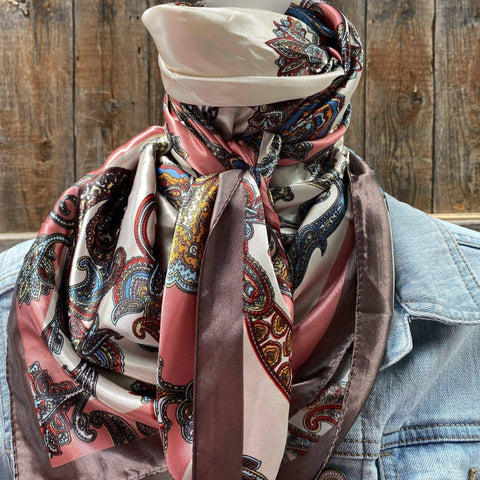 Our classic wild rag/scarf in pink, brown and cream paisley pattern. It is a square and measures 35" x 35". It is sure to add a bright pop of color to any outfit.