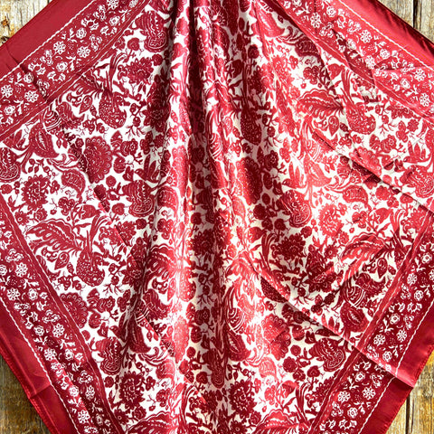Our classic wild rag/scarf in a deep red decorated with a soft cream paisley. It is a square and measures 35" x 35". It is sure to add a bright pop of color to any outfit.