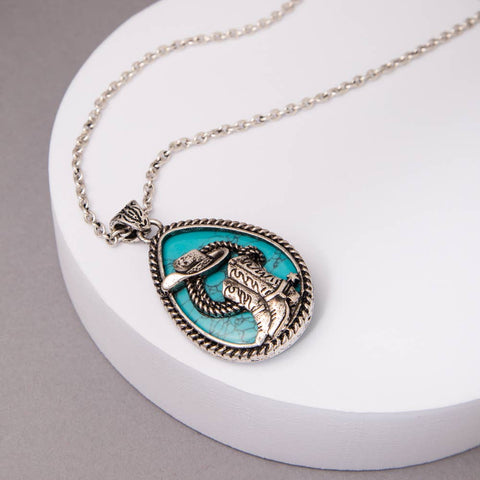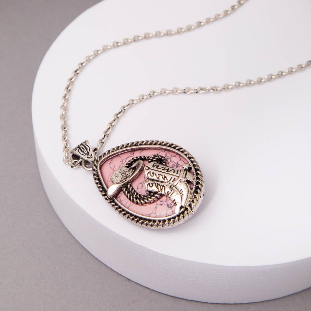 Channel the enduring spirit of the Wild West with this striking Hat & Boot Teardrop Pendant Necklace, beautifully crafted in oxidized silver-tone metal. Choose from vibrant pink or bold blue turquoise accents that highlight the playful hat and boot design set within a teardrop-shaped pendant. This necklace exemplifies southwestern charm blended with country glam, making it a standout piece for any cowgirl's wardrobe.