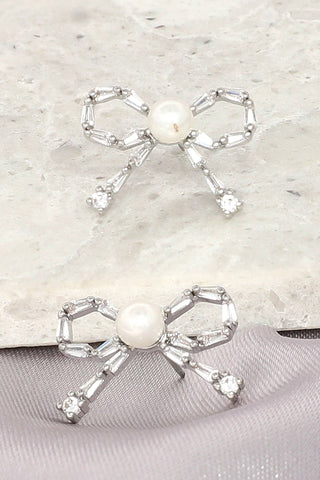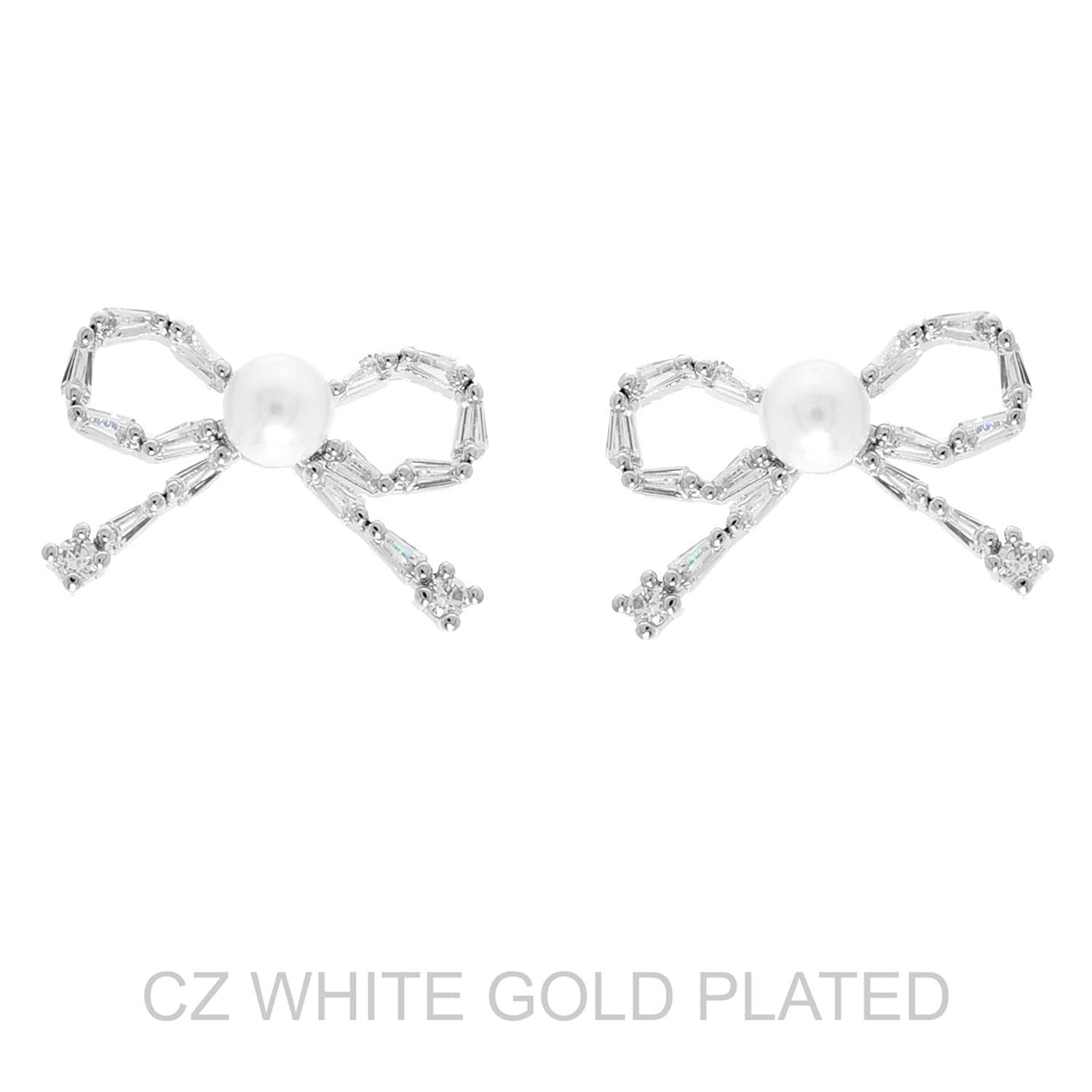 SP Sophia Collection - White Gold Plated Pearl CZ Bowknot Post Earrings