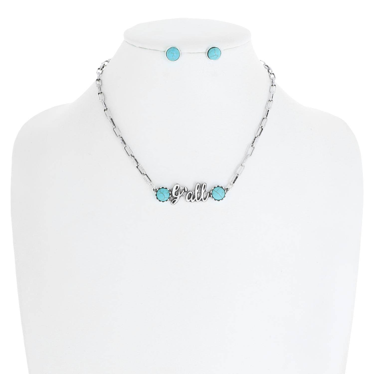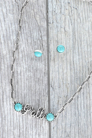 This necklace set features a pendant with the word "Y'all" made of turquoise semi stones on a silver chain. The pendant hangs from a delicate paperclip chain that adds a touch of elegance to the design. The matching earrings have the same turquoise semi stones, making for a coordinated and cohesive look. The semi stones are set in a silver tone metal, which complements the vibrant turquoise color beautifully. The necklace is adjustable, making it versatile enough to wear at different lengths depending on your outfit and style preference. This set is perfect for those who want to add a touch of southern charm to their jewelry collection.