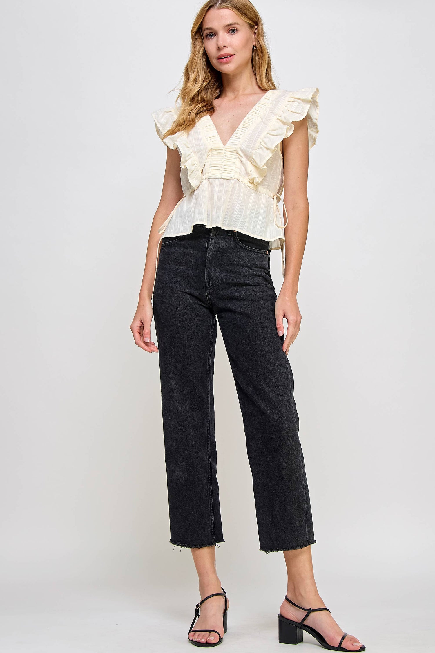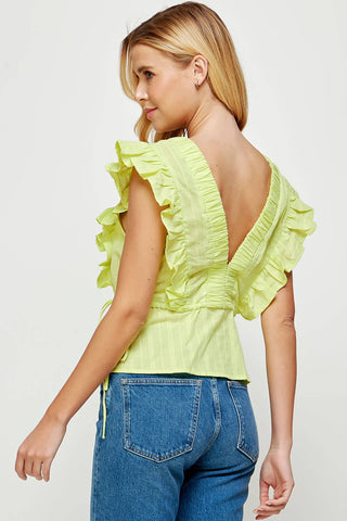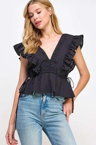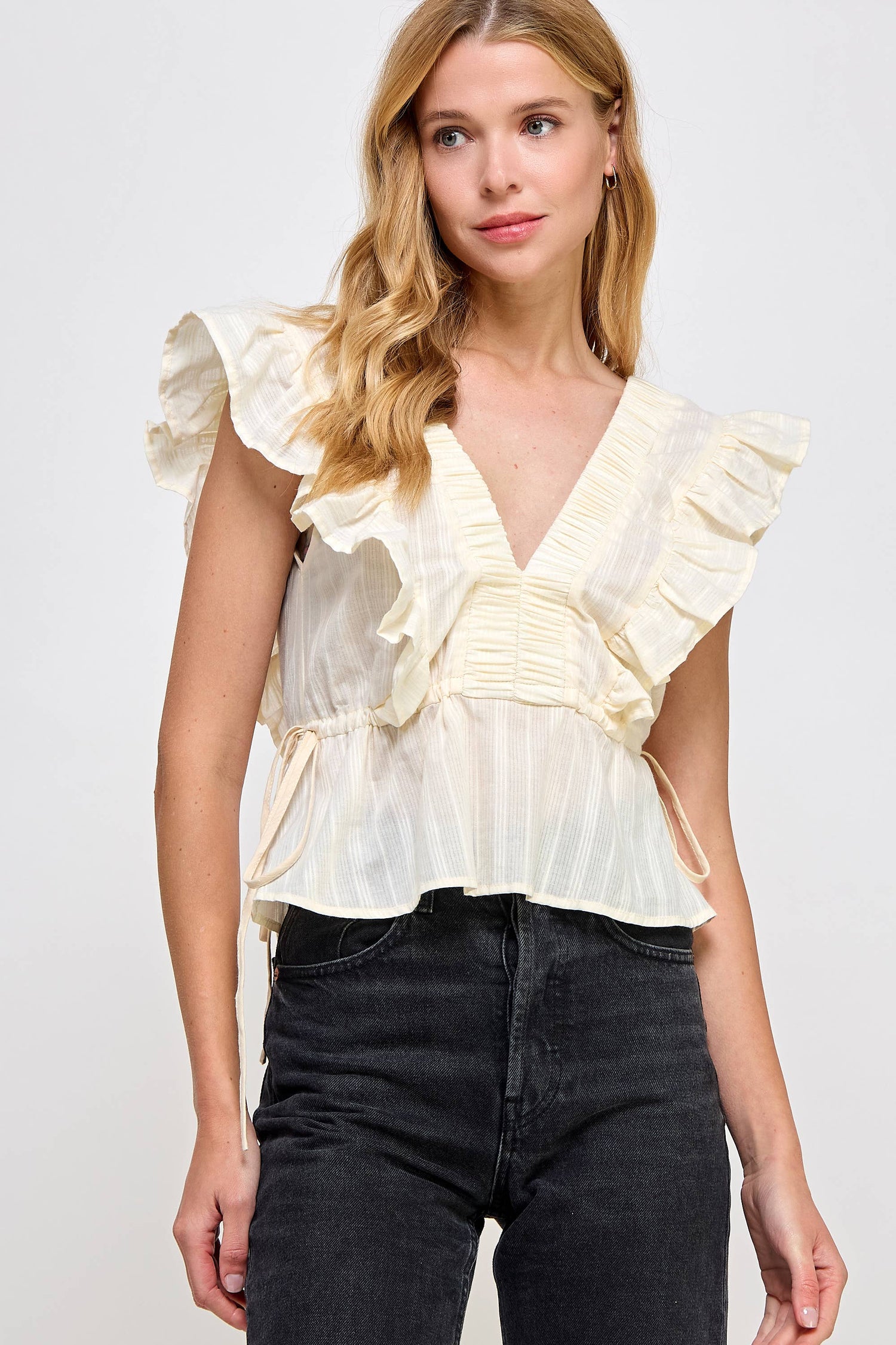 Smocked detail ruffle top in textured striped cotton voile fabric. This ruffles frill sleeveless style features a classic front/back V neck, smocking detail at front/back, and adjustable drawstring bow tie at waist for flattering.