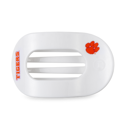 Lay flat and relax with the new TELETIES Clemson University, Go Tigers! Large Flat Round Hair Clip in White, Orange, and Purple. This hair clip is designed to allow you to lay back flat, do yoga, or sit comfortably in a seat with a headrest, and it is made with the same material that is nearly unbreakable. Shop your favorite Clemson University hair accessories now! Go Tigers!
